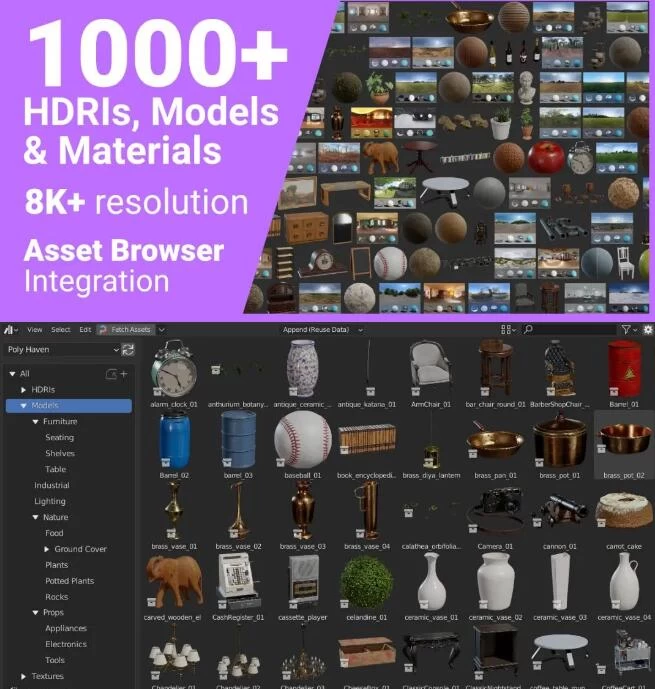 这个插件让您可以直接在 Blender中更快地访问它们。安装插件后,只需通过在您的首选项中创建一个新的资产库来选择您想要存储我们所有资产的文件夹。然后在资产浏览器中,您会找到一个按钮来获取我们所有资产的低分辨率版本。单击此按钮将下载大约 4GB,第一次可能需要几分钟。然后只需将资产拖放到您的场景中!资产被分组到左侧的目录中,因此您可以轻松过滤到您要查找的内容。标签也已加载,因此也可以随意尝试搜索!