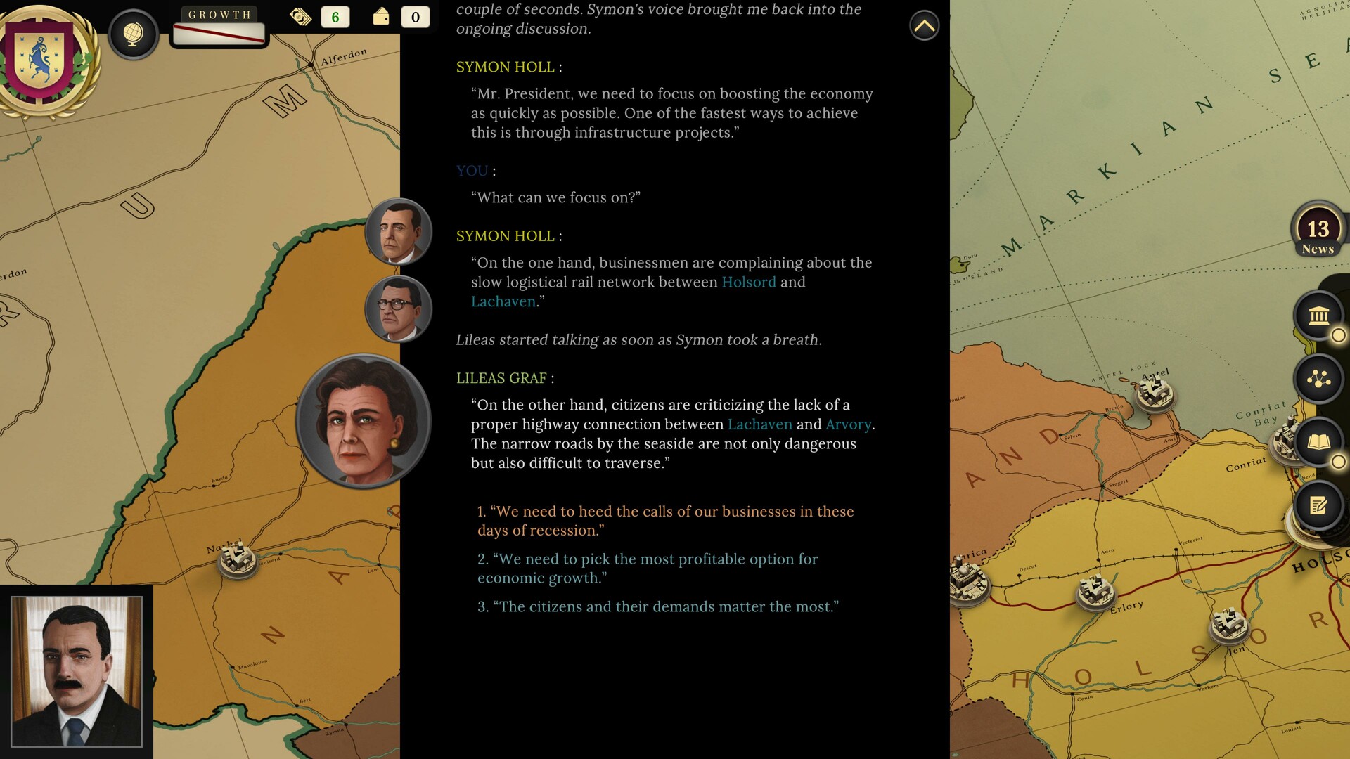 你将在这个基于文本的角色扮演游戏中出任雷恩总统,并在第一个任期中决定索德国是陷入萧条,或是迈向复兴。通过与内阁成员以及其他权要的对话,上演一出精彩的政治大剧。是警惕还是接纳腐败;是逃避还是坚持理想。 你会如何领导这个国家
