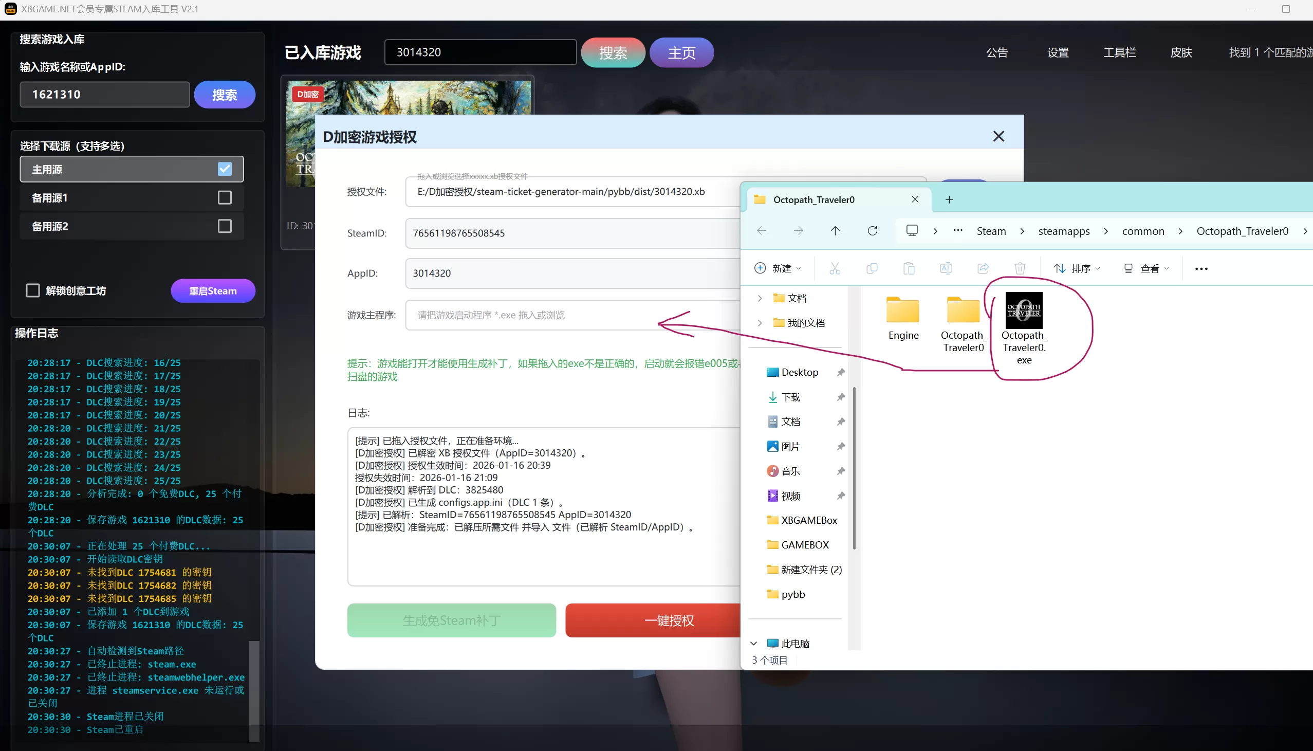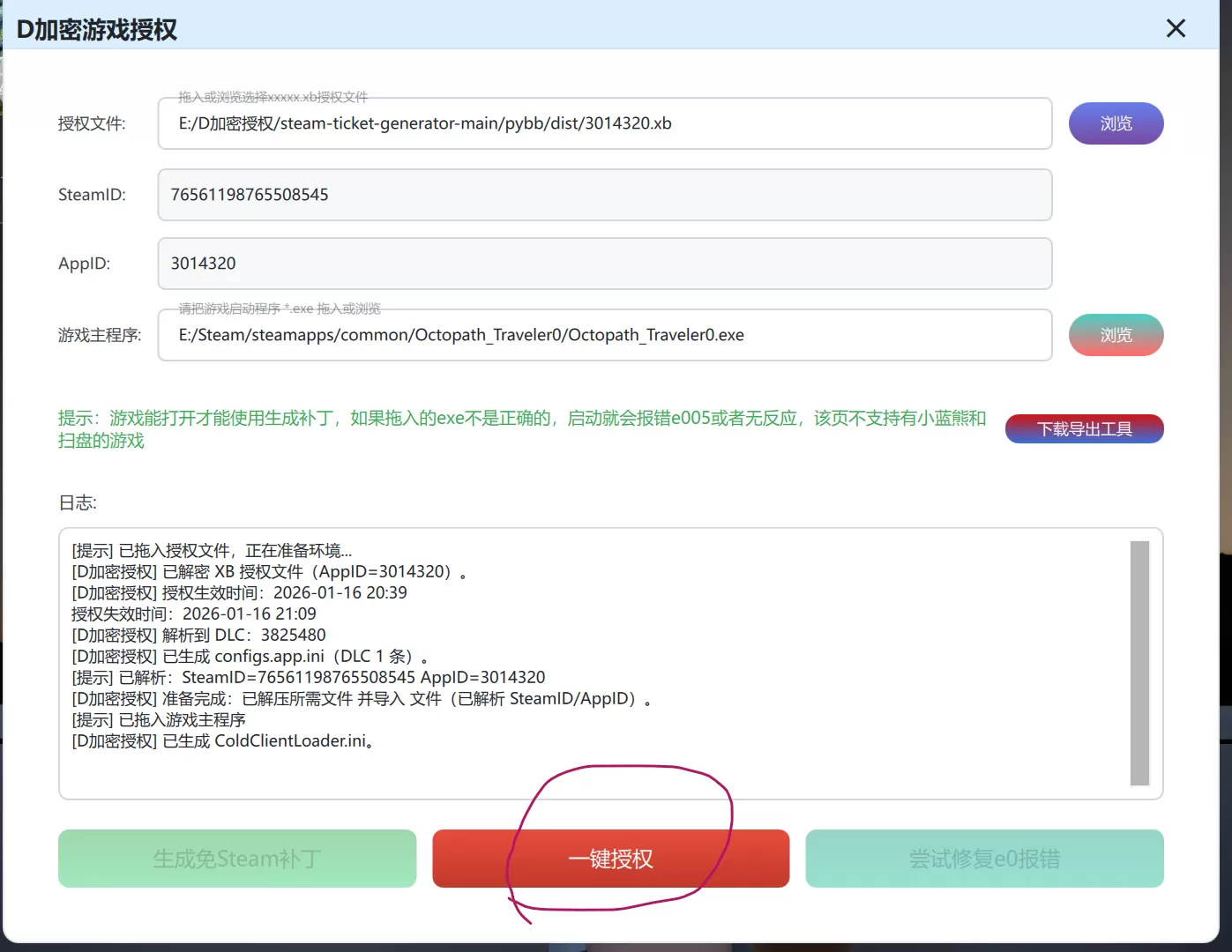 拖入xxxx.xb授权文件,软件会自动识别游戏启动器,然后直接点一键授权启动(这个授权文件需要自己找正版账号提取,家庭共享,正版租号、或者离线版都行,(某宝某多租一小时0.5元,一小时起租提取过程只需要几秒钟。)暂时先自行提取,过后网站会专门整理一些正版账号供你们提取授权。