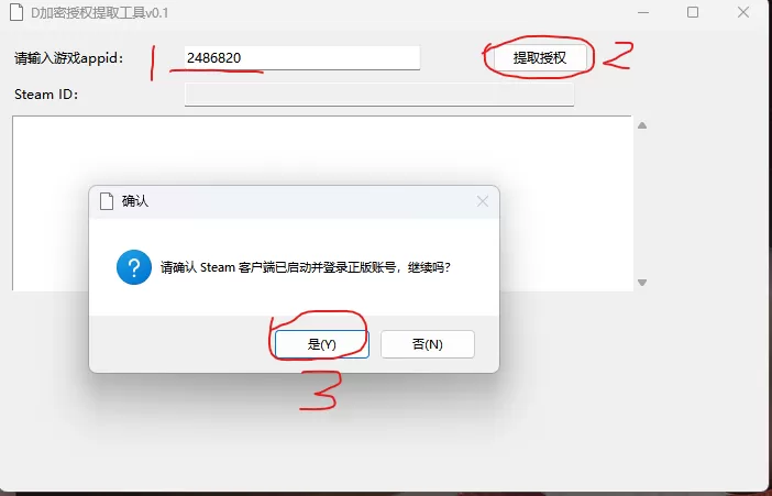 打开steam,登录正版账号,然后输入你要提取那个D加密游戏的AppID,然后点击提取授权按钮,在工具同目录下得到一个xxxx.xb的文件。
