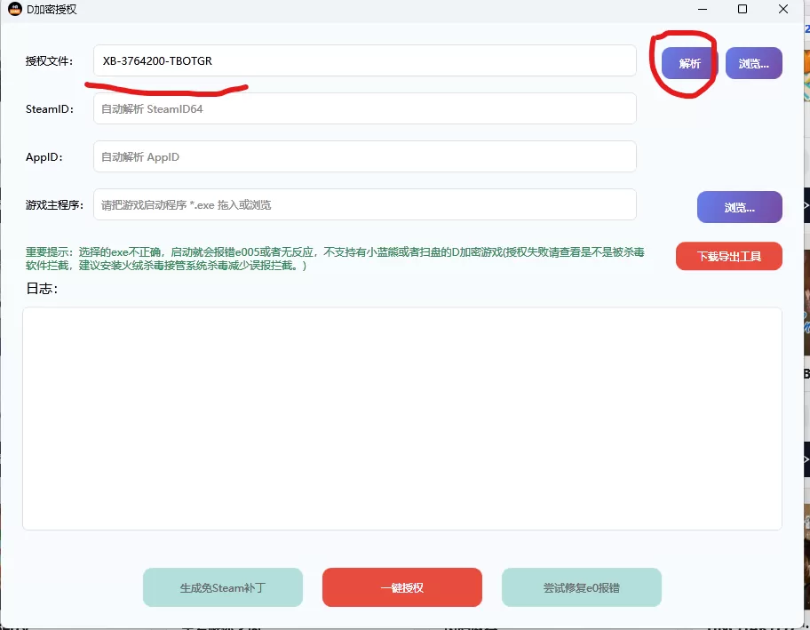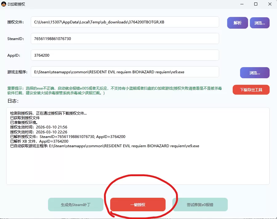 5、程序解析好后,点击一键授权。