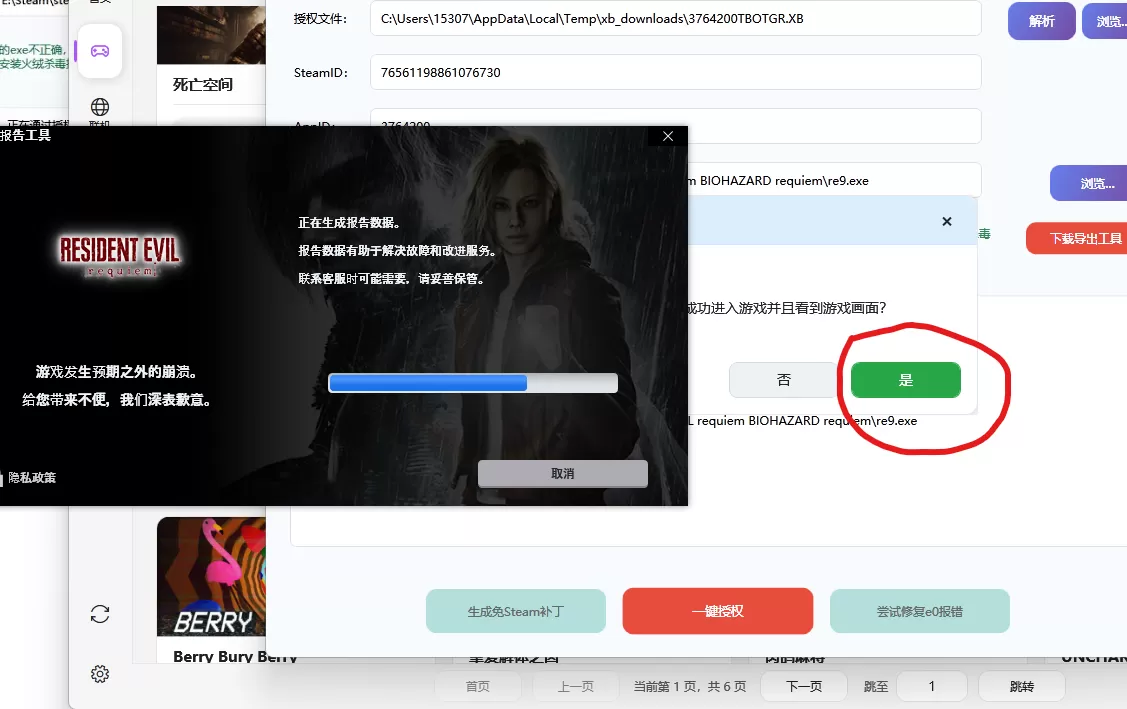 程序会启动生化危机9,这个时候是进不去的,看到下面这个报告工具窗口就点是。