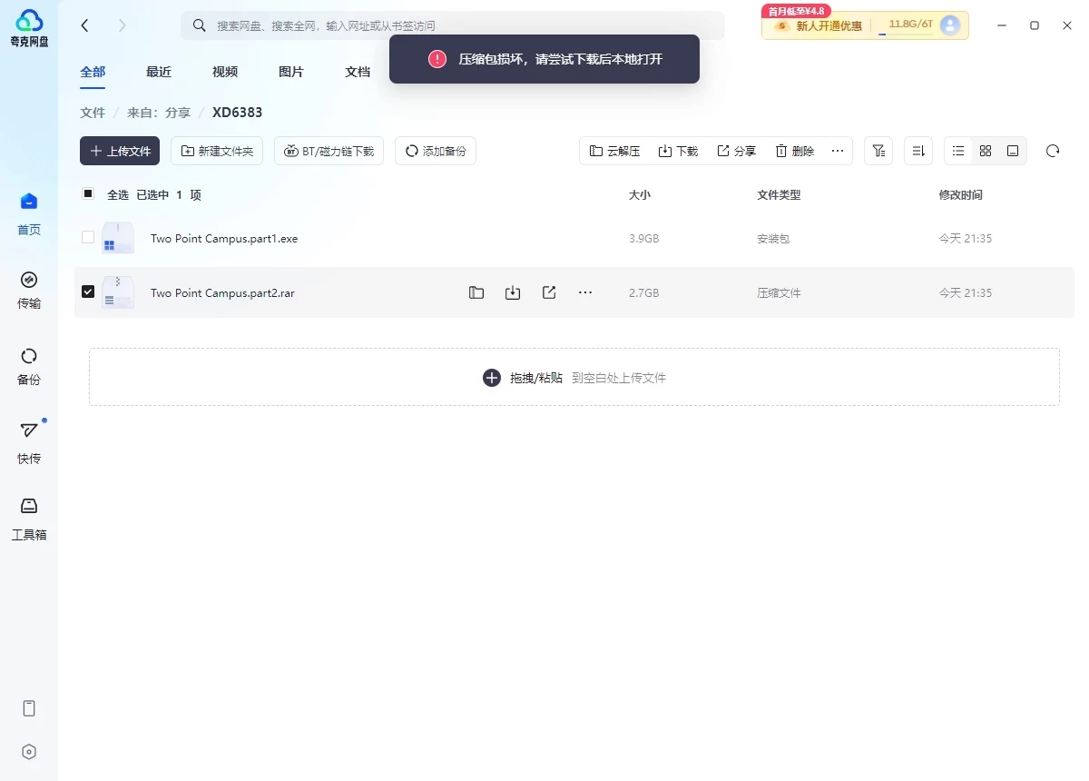 压缩包损坏,无法解压,下载的大小和分享的盘内一样的,下载下来解压显示选中卷的第一部分,但是第一卷不是压缩文件